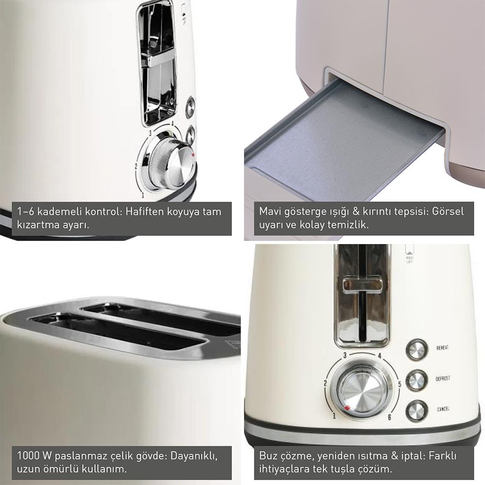 Buz çözme, yeniden ısıtma ve iptal ayarları gibi fonksiyonel özellikleriyle günlük kahvaltılarınızı pratik hale getirir. Mavi gösterge ışığı, kırıntı tepsisi ve kablo saklama bölmesi gibi detaylar kullanım kolaylığı sağlar.