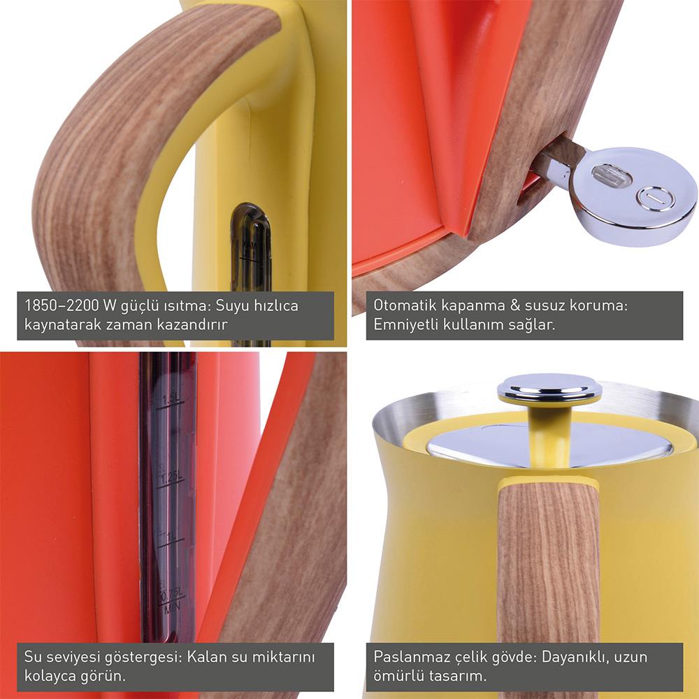 Canlı sarı rengiyle mutfaklara enerji katan Berghoff kettle, 1850–2200 W gücüyle hızlı ve güvenli su ısıtma deneyimi sunar. 1,7 litre kapasitesi sayesinde hem kalabalık aileler hem de ofis kullanımı için idealdir. Paslanmaz çelik gövdesi uzun ömürlü kullanım sağlarken, 360° dönebilir tabanı ve ergonomik tasarımı ile kullanım kolaylığı sunar.