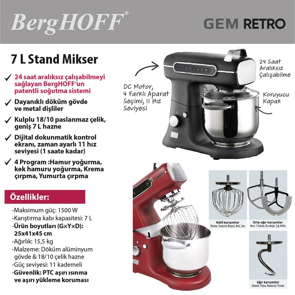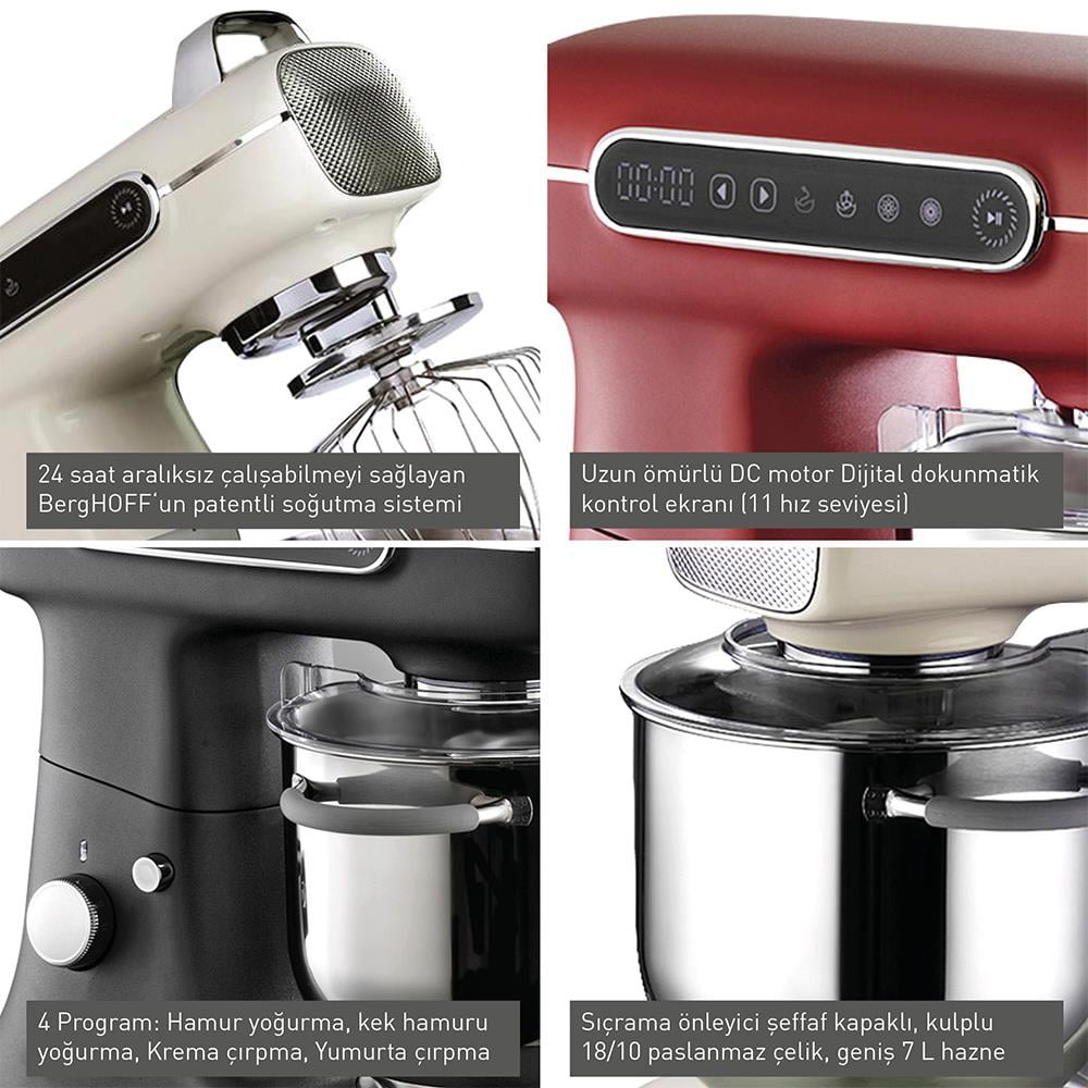 Berghoff’un dikkat çekici kırmızı rengiyle mutfağınıza enerji katın! 1500W gücündeki sessiz motoru sayesinde kek, pasta ve hamur işlerini kolayca hazırlayın. 7 litrelik kulplu paslanmaz çelik haznesi geniş hacmiyle büyük porsiyonlar için idealdir.