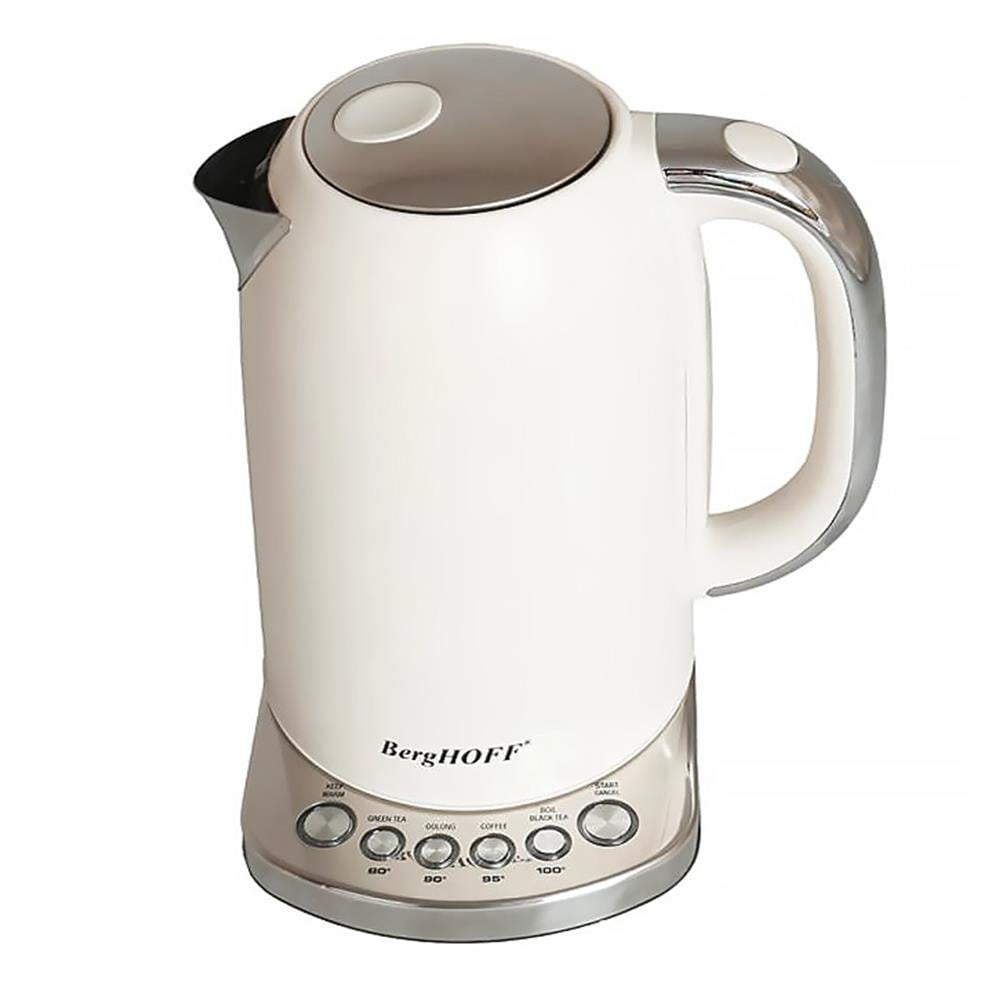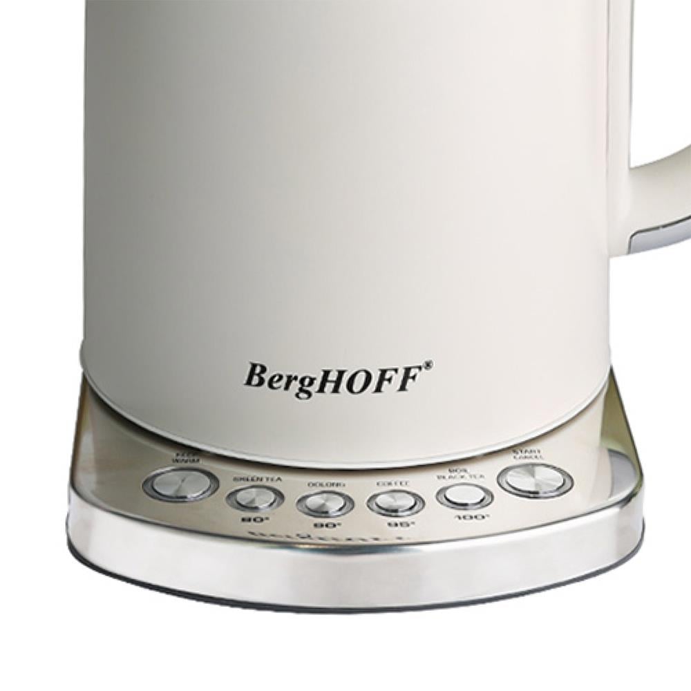 Şıklığı ve işlevselliği bir arada sunan Berghoff kettle, vanilya krem retro rengiyle mutfağınıza zarafet katarken 1,7 litre kapasitesiyle günlük kullanım için idealdir. Elektronik taban üzerinden 80°C, 90°C, 95°C ve 100°C gibi sıcaklık seviyeleri seçilebilir; bu sayede yeşil çay, kahve ya da siyah çay için ideal demleme sıcaklığını elde edebilirsiniz.