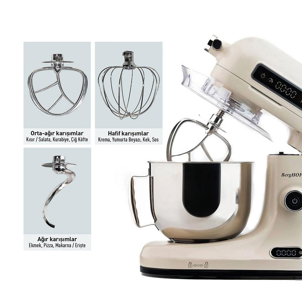 Profesyonel performans mutfağınızda! 1600W güçlü AC motoru ve entegre dijital terazisi ile Berghoff Stand Mikser, kusursuz sonuçlar için tasarlandı. Hamurdan kek karışımına kadar her aşamada ideal kıvamı yakalamanıza yardımcı olur. Dokunmatik ekranıyla hız, süre ve turbo fonksiyonlarını zahmetsizce kontrol edebilirsiniz.