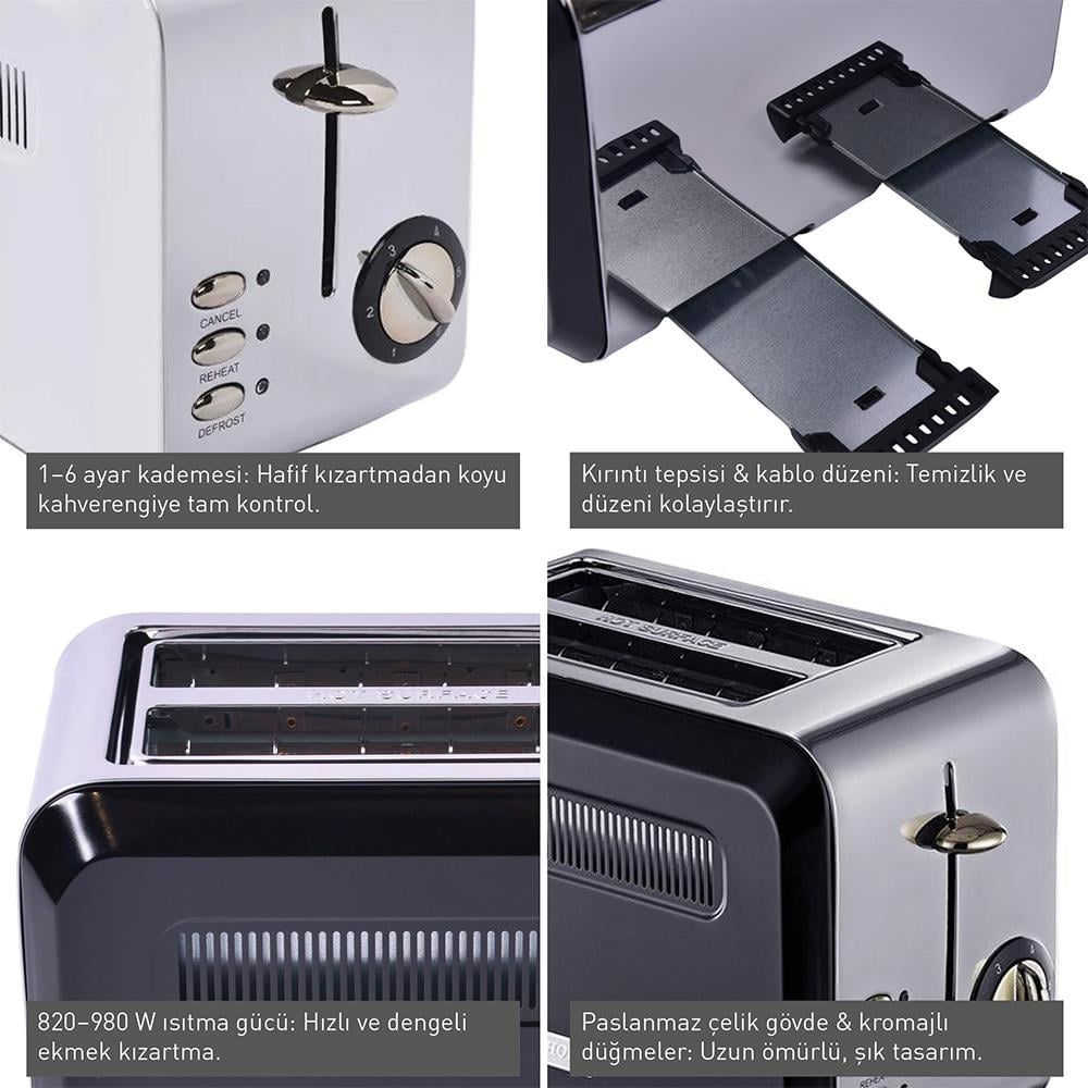 Çift bağımsız kontrol paneli sayesinde her iki dilim grubunu farklı ayarda çalıştırabilir, 6 kademeli kızarma seviyesi ile tam damak tadınıza göre ayarlama yapabilirsiniz. Buz çözme, yeniden ısıtma ve iptal fonksiyonları da kullanım kolaylığı sağlar.