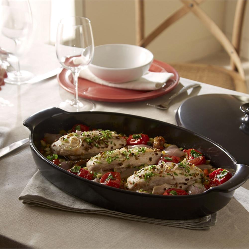 Papillote buharlı pişirici, her çeşit balığı basit ve kolay bir şekilde pişirmenizi sağlar! HR seramiğimiz sayesinde balıklar nazikçe ve eşit şekilde pişirilir. Kapak her türlü balık kokusunu içinde tutar ve buharlı pişirme için kapalı bir ortam oluşturur. Bütün veya porsiyonlar halinde pişirilen balıklarınız, herhangi bir yağ eklemeden yumuşak kalır. Balığınızı kabın ortasına koyun, biraz sebze ve baharat ekleyin, kapağı kapatın ve sıcak fırına koyun!
