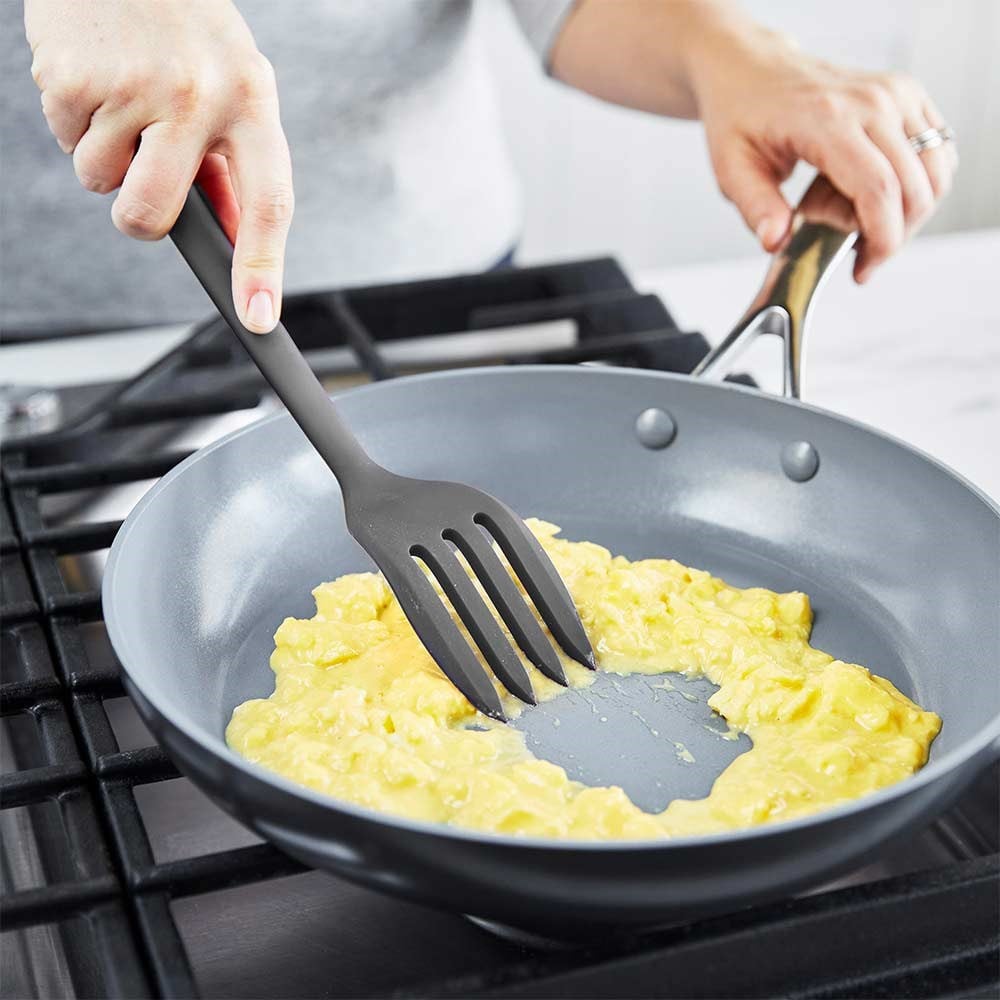 Mutfakta çok yönlü kullanım için geliştirilen bu özel tasarım çatal; karıştırma, çırpma, ezme, kazıma ve çevirme gibi birçok işlemi tek bir gereçle yapmanıza olanak tanır. GreenPan’in sağlıklı mutfak vizyonuna uygun olarak tasarlanan yapısı, çeliğin gücünü gıda dostu silikonla birleştirerek mutfaktaki en işlevsel yardımcılarınızdan biri olur.