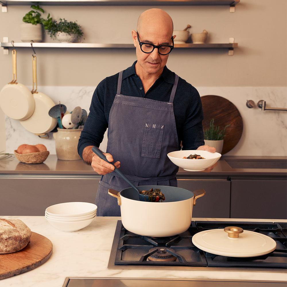 Stanley Tucci, yemek pişirmeyi bir üst seviyeye taşıyan inovasyona odaklanarak sıfırdan bir pişirme gereçleri koleksiyonu yaratmak için GreenPan ile ortaklık kurdu . İtalya'daki son teknoloji GreenPan fabrikasında üretilen bu Hollanda fırını, Stanley'nin annesinden aldığı eski İtalyan tencerelerinden esinlenerek tasarlanmış.