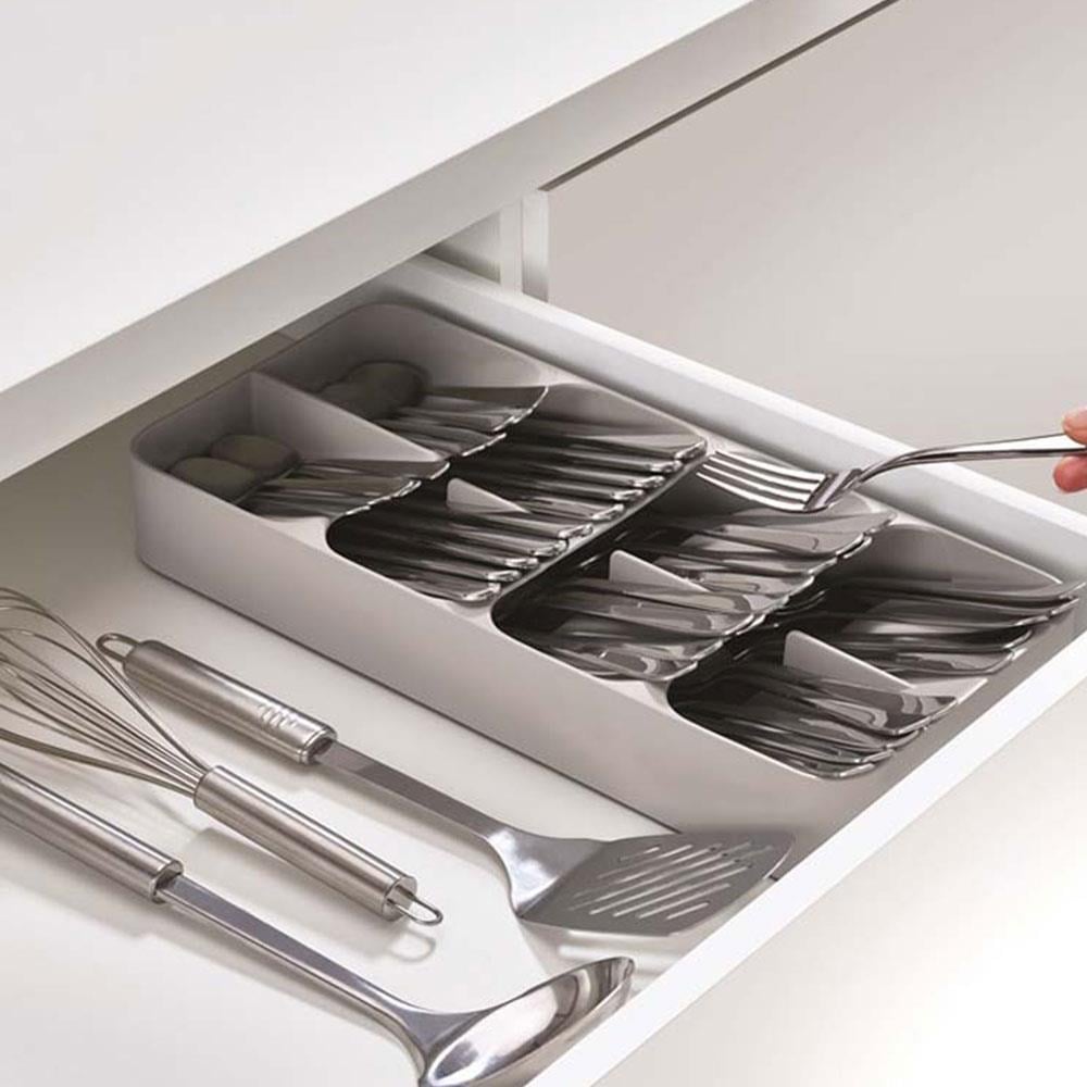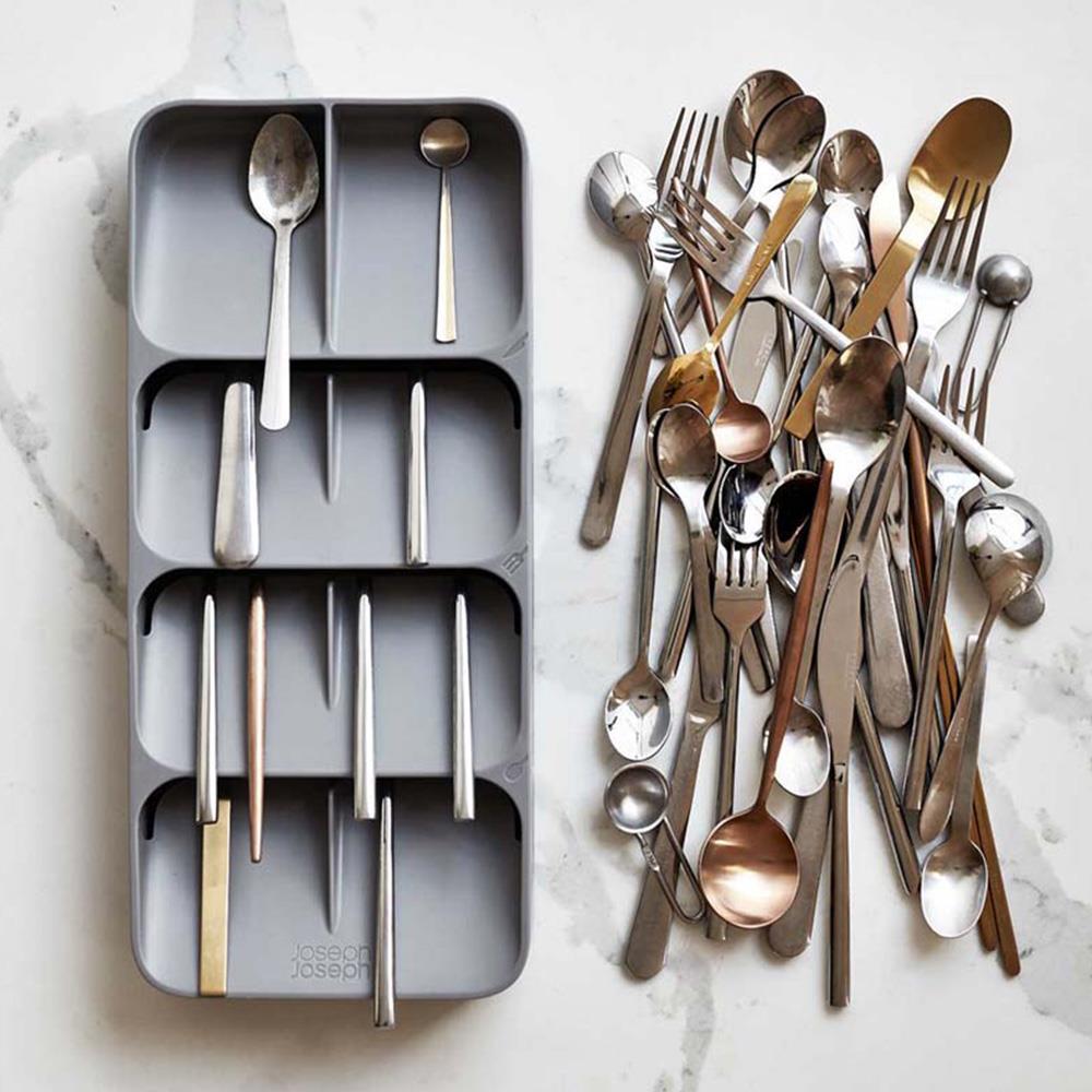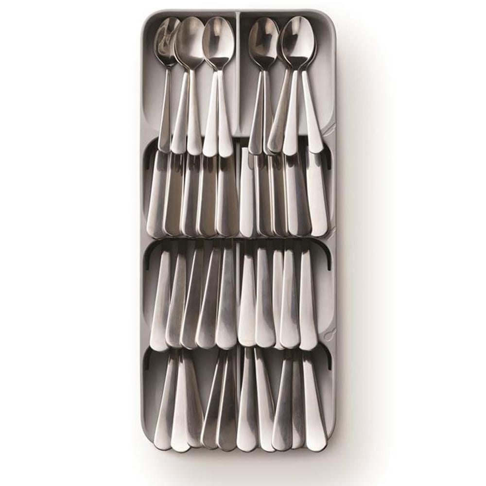 Bu düzenleyicinin en belirgin özelliği, bölmelerin açılı ve üst üste binen yapısıdır. Bu akıllı tasarım, standart bir kaşıklığın kapladığı alanın yarısından azını kullanarak aynı miktarda çatal-bıçak setini (48 parçaya kadar) düzenli bir şekilde saklamanıza olanak tanır.