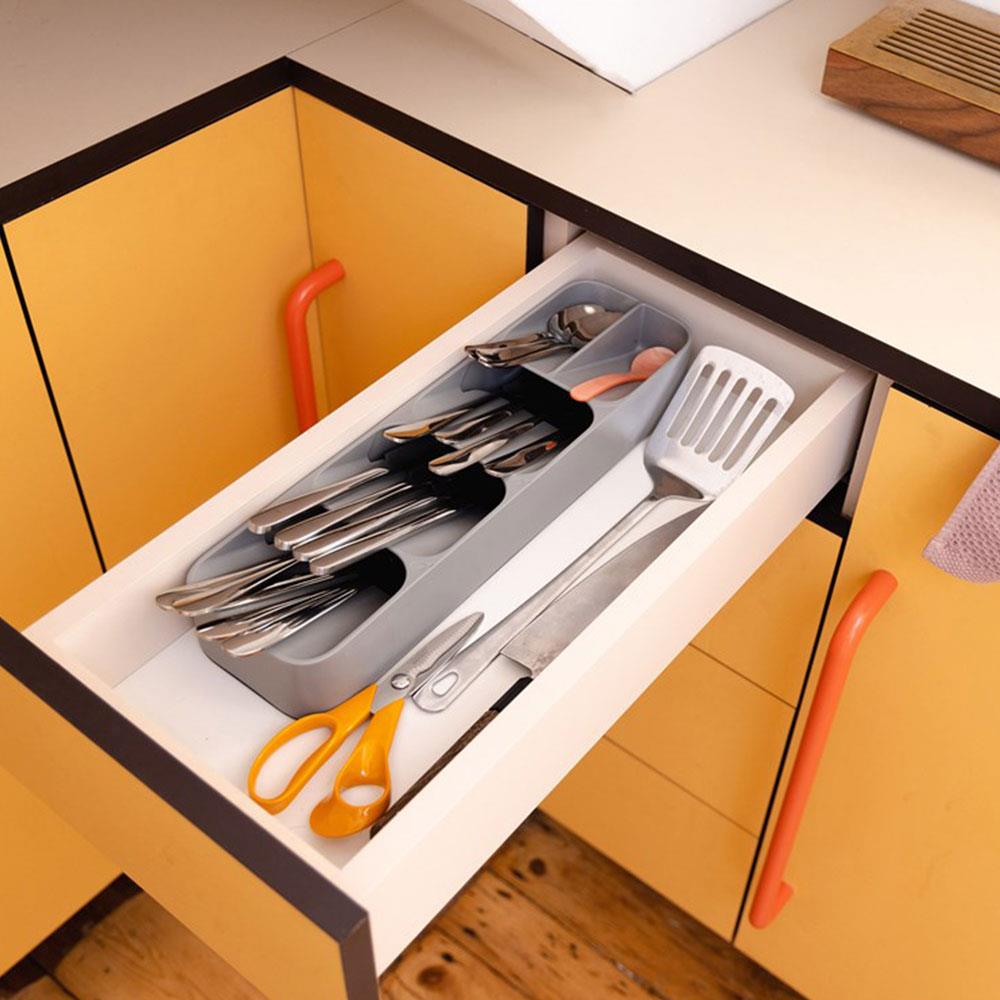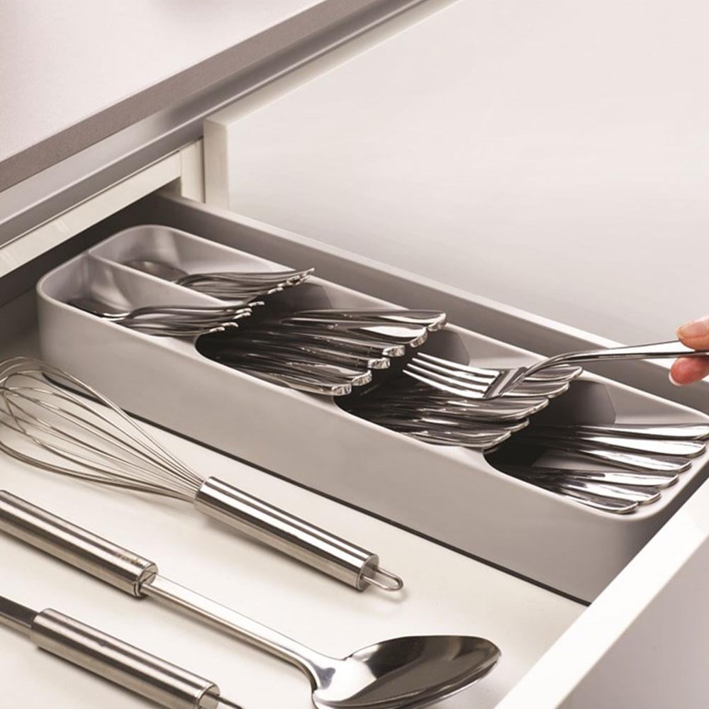 Bu Düzenleyicinin En Önemli Özelliği, Çatal Ve Kaşıkların Birbirinin Üzerine Gelecek Şekilde Açılı Olarak Yerleştirilmesini Sağlayan Katmanlı Bölmeleridir. Bu Akıllı İstifleme Yöntemi, Tam Boyutlu Bir Çatal Bıçak Takımını Çok Daha Dar Bir Alanda Saklamanıza Olanak Tanır.