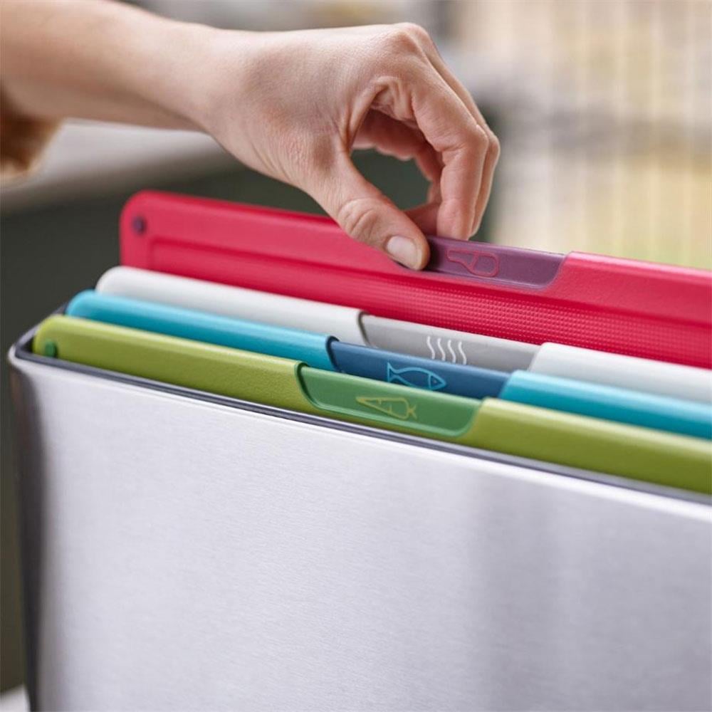 Folio™ Kesme Tahtası Seti, Mutfak Hazırlık Süreçlerinizi Düzenlemek Ve Gıda Güvenliğini Artırmak İçin Tasarlanmış İkonik Bir Tasarımdır. Dört Farklı Renkteki Tahtanın İnce Ve Şık Bir Stand İçerisinde İstiflenmesi, Mutfak Tezgâhınızda Hem Yer Tasarrufu Sağlar Hem De Modern Bir Görünüm Yaratır.