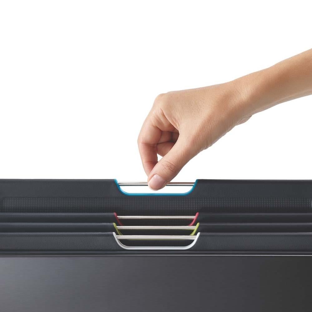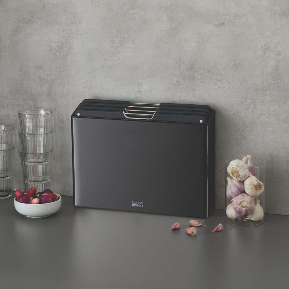 Her bir tahtanın kenarında yer alan paslanmaz çelik tutma çubukları, tahtayı standın içinden kolayca ve hızlıca seçip çıkarmanıza olanak tanır. İnce tasarımı sayesinde tezgah üzerinde çok az yer kaplayarak alan tasarrufu sağlar.