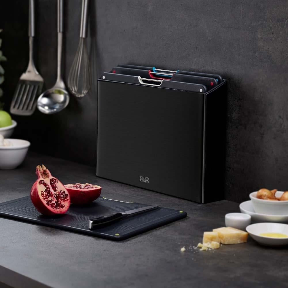 Folio™ Kesme Tahtası Seti, yemek hazırlık sürecini daha düzenli, güvenli ve estetik bir hale getirmek için tasarlanmıştır. Şık siyah saklama standı içerisinde yer alan dört farklı renk kodlu tahta, gıda türleri arasında çapraz bulaşma riskini ortadan kaldırırken mutfağınıza sofistike bir dokunuş katar.