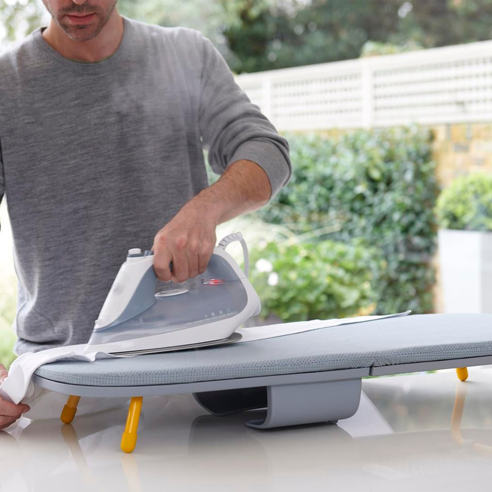Ütüleme Yüzeyi, Hızlı Ve Verimli Sonuçlar Almak İçin %100 Pamuklu Bir Örtü Ve Kalın Keçe Katmanı İle Donatılmıştır. Kaymayı Önleyen Ayakları Sayesinde Masa Üstünde Tam Stabilite Sağlar. Ayrıca, Ütüleme Esnasında Masanın Katlanmasını Önleyen Güvenli Bir Kilitleme Mekanizmasına Sahiptir.