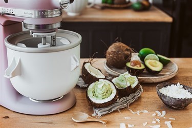 Dondurma kabını KitchenAid stand miksere koyun ;aksamını ve göstergeyi takın.
