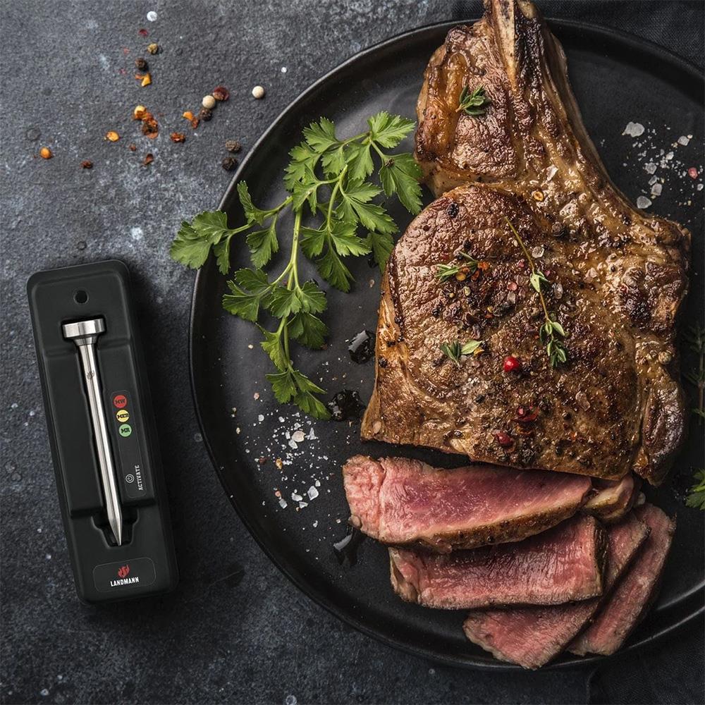 Landmann'ın LED ızgara termometresi ile bifteğiniz tam istediğiniz gibi olacaktır. Şimdi tek yapmanız gereken, istediğiniz ışığın yanmasını beklemek: yeşil, bifteğinizin orta pişmiş, sarı orta ve kırmızı orta iyi anlamına gelir.Ardından bifteği ocaktan alın ve LED ışığının yanıp sönmesi durana ve LED ızgara termometreniz otomatik olarak kapanana kadar dinlendirin.