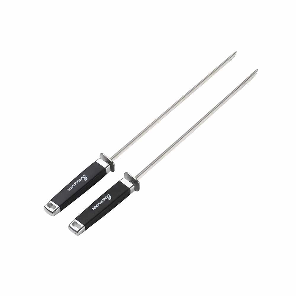 LANDMANN Pure paslanmaz çelik ızgara şiş takımı, üçgen bıçak şekli ve kazıma yardımı ile farklı ızgara tiplerinin ihtiyaçlarına özel olarak uyarlanmıştır. Toplam uzunluğu 40,5 cm olan et ve sebze parçaları iki şiş üzerinde yeterli yer bulmaktadır.