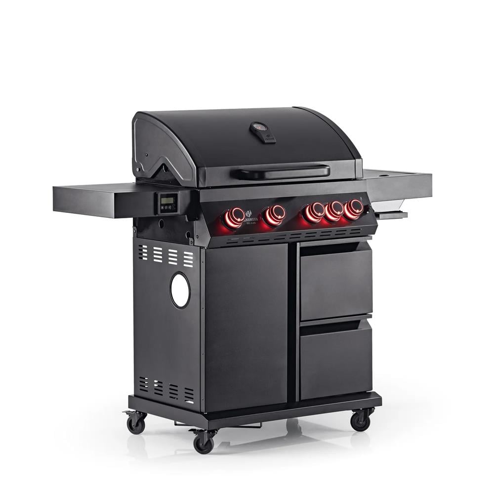 Landmann Cool Black MaxX 4.1, köklü Alman geleneğini modern teknolojik çözümlerle birleştiren en yeni nesil gazlı ızgaraları temsil ediyor. Dört paslanmaz çelik brülör ve mükemmel bir kabuk için 800°C'ye kadar ısıya ulaşabilen bir kızılötesi yan brülör (sear burner) ile donatılmıştır.