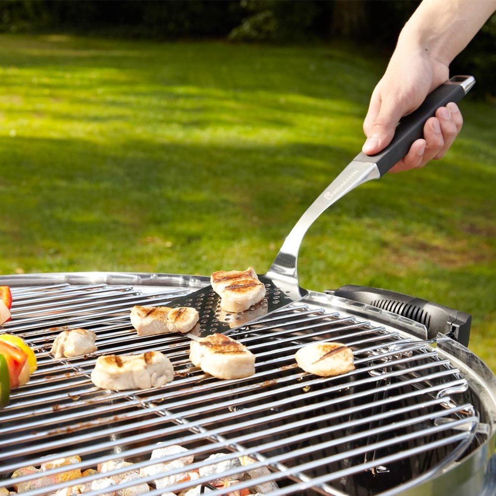 Yüksek kaliteli Landmann Pure ızgara döndürücü, ergonomik şekilli paslanmaz çelik döner yüzeyi ile ızgara yiyeceklerin basit ve rahat bir şekilde işlenmesini sağlar. Döner başlığın montaj yüzeyi büyük ızgara yiyecekler için de uygundur.