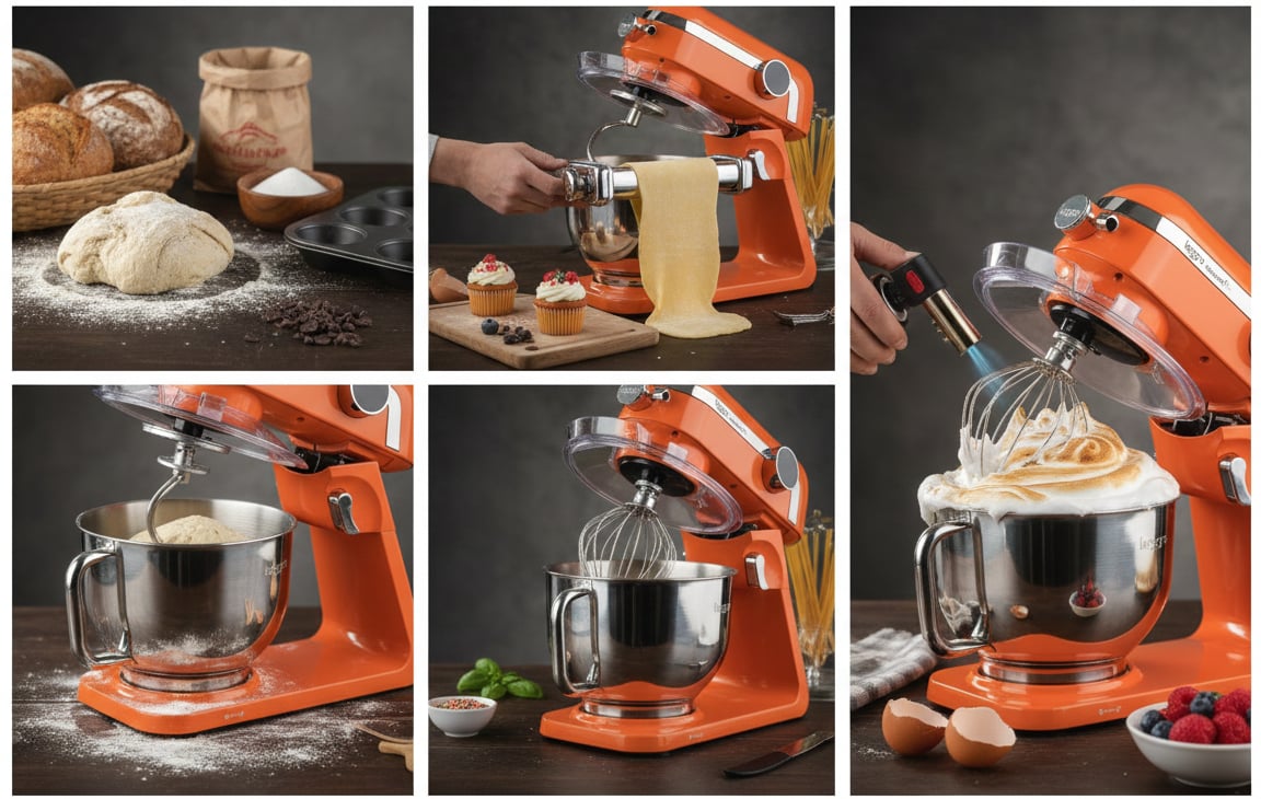 Leggno Gourmet Pro Stand Mikser, çırpıcı, hamur kancası, hamur sıyırma ve hamur karıştırma aparatı gibi çeşitli aksesuarlarla birlikte gelir. Bu aksesuarlar, farklı tarifler için mükemmel sonuçlar elde etmenizi sağlar. Çırpıcı, krema ve yumurta beyazlarını kabarık bir kıvama getirirken, hamur kancası, ekmek ve pizza hamurlarını yoğurmak için idealdir. Hamur sıyırma aparatı ise, karıştırma kabının kenarlarındaki malzemeleri toplayarak homojen bir karışım elde etmenize yardımcı olur.