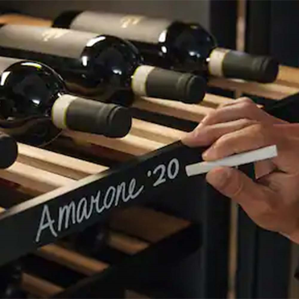 Her rafın ön kısmında bulunan manyetik, çıkarılabilir bölmelere özel tebeşir kalemi ile notlar yazabilirsiniz. Bu sayede dolabı açıp şarapları tek tek incelemeden, hangi rafta hangi bölgenin veya hangi yılın şarabı olduğunu kolayca görebilirsiniz.