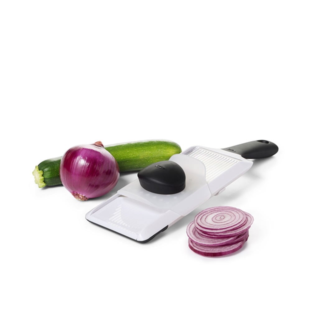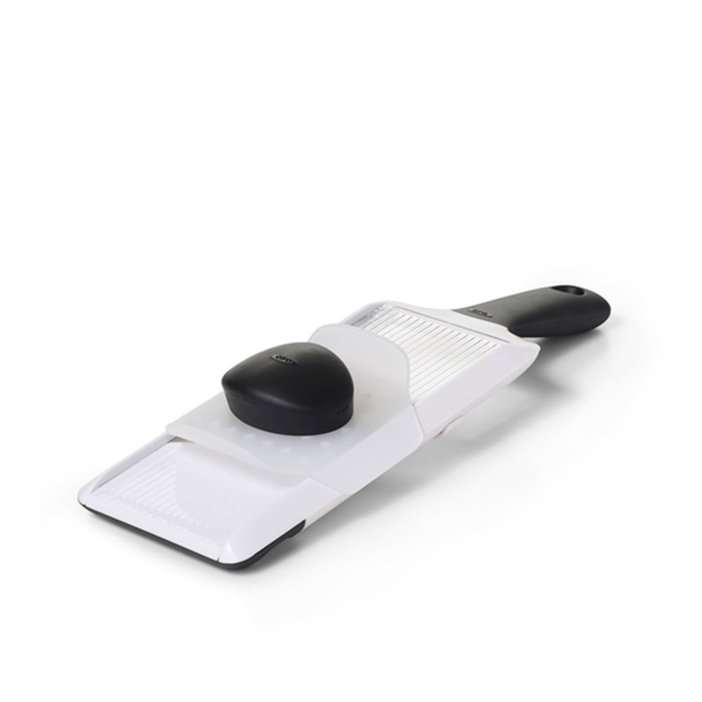 Kolayca kavranan ergonomik sapı, keskin çelik bıçağı ve şeffaf gövdesi ile OXO GG el mutfak mandolini, yemek hazırlığı sürecinde sıkça kullanılacak pratik bir üründür. Yandan ayar düğmesi sayesinde üç farklı boyda dilimleme yapılabilir. Dilimleme direk kesme tahtası üzerine veya bir kase içine yapabiliyor. İşlem sırasında malzemeyi sabitlemek için kullanılan tutma aleti eli koruduğu gibi, ürün kullanılmadığında bıçağı kapatarak emniyet sağlıyor. OXO GG el mandolini, dilimleme işlemi sırasında kase üzerinde dengeli tutuşu sağlamak için yumuşak ayak desteğine de sahiptir. Bulaşık makinasında yıkanabilir.