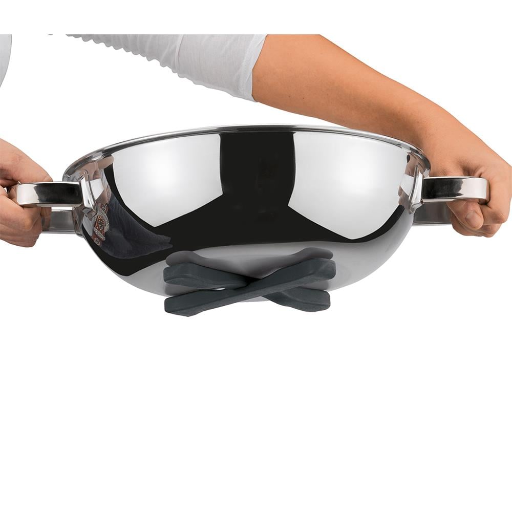 Kullanımı inanılmaz derecede kolaydır. Tencereyi veya tavayı sac ayağının üzerine yerleştirin, kaldırın ve masanın üzerine yerleştirin. Trivet dış zemine yapışıyor. Lütfen unutmayın: Nihaleyi kullandıktan sonra, soğutulmuş tabandan çıkarın ve tabii ki, nihale takılıyken tencereyi veya tavayı açık ocağın üzerine veya içine veya hala sıcak olan bir ocağın üzerine ASLA koymayın.