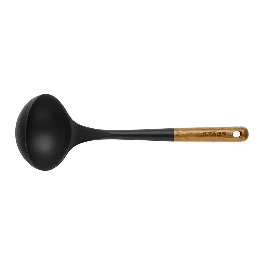 Ahşap sap ergonomik olarak tasarlanmıştır ve bir mutfak rafından sarkan kepçeyi saklamak için bir delik olarak tasarlanmıştır.