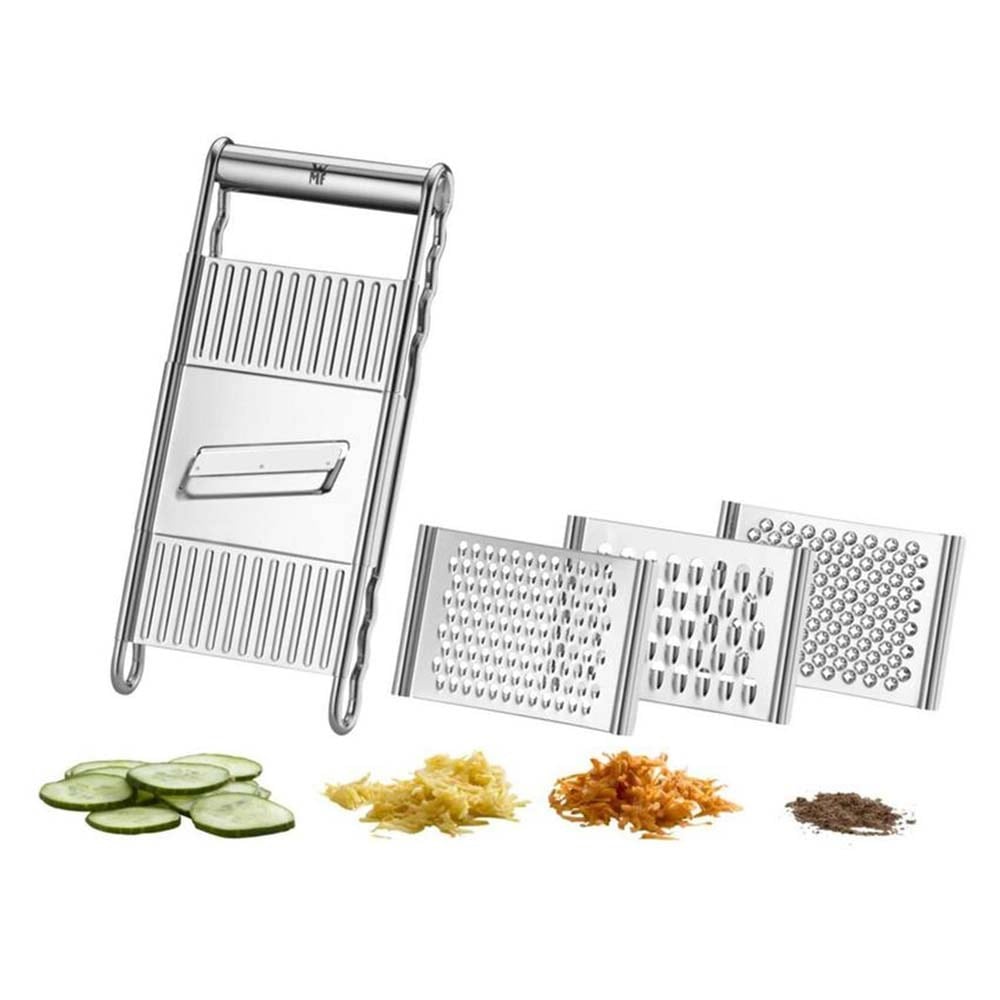 Eşi benzeri olmayan 4'ü 1 arada : WMF Çok İşlevli Rende, en sevdiğiniz tüm malzemeleri mükemmel bir şekilde rendelemek, parçalamak ve dilimlemek için mükemmel sonuçlar verir. Bu çok yönlü peynir rendesi ve sebze dilimleyici kombinasyonu, sert peynirler, meyveler ve sebzeler için ideal olan, tamamı WMF'in kendi uzun ömürlü Cromargan: paslanmaz çelik 18/10'dan hazırlanmış dört adet değiştirilebilir parçaya sahiptir: rende, parçalayıcı, ince parçalayıcı ve dilimleyici.
