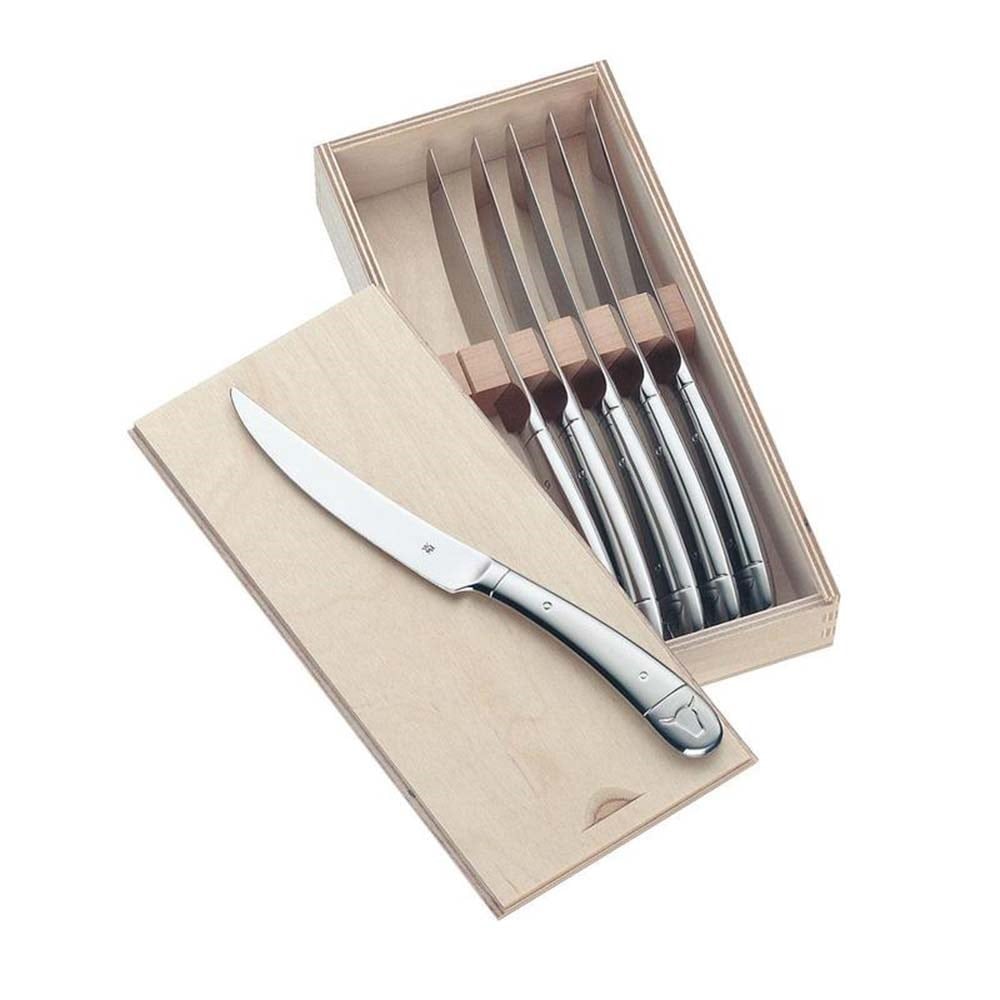 Tabağınızda sulu bir biftek varsa, ihtiyacınız elinize mükemmel şekilde oturan keskin bir bıçaktır. WMF et bıçakları ve et çatalları tam size göre. Bıçaklar mangalda pişen, dışı çıtır çıtır olan etleri kolayca keser ve kalın et parçalarında da yağ gibi kayar. Özel çelikten yapılan son derece keskin bıçak, çok keskin olan ve keskinliğini uzun süre koruyan yüksek kaliteli tırtıklı kenara sahiptir. Cromargan® paslanmaz çelik malzeme sayesinde, tüm parçalar hijyeniktir, aside karşı dirençlidir ve bulaşık makinesinde yıkanabilir. Pratik sap kısmında çarpıcı bir boğa başı resmedilen ve ahşap hediye kutusuna yerleştirilen 6 parçalı set, özgün bir et deneyimini garantiler.