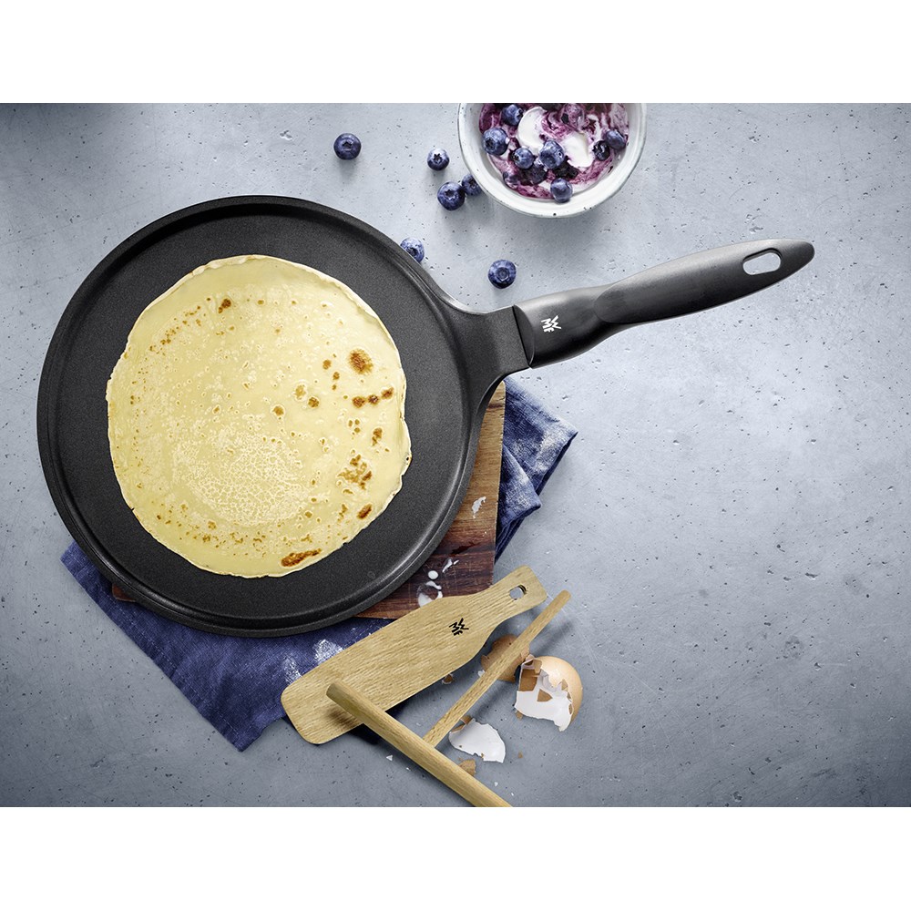 WMF Krep Tavası, mükemmel krepler ve pankekler hazırlamak için özel bir tasarım sunmakta. Uzun ömürlü 3 katmanlı PermaDur yapışmaz kaplaması, performansı zahmetsiz temizleme ile birleştirir ve kalın dökme alüminyum yapısı olağanüstü derecede eşit pişirme sağlar. Sonuç olarak , her seferinde gevrek, altın renkli krepler ve lezzetli kabarık kreplerdir. Güvenli, rahat kullanım için ısı yalıtımlı bakalit kulp ve özel ahşap aksesuarlar onu tamamlar.