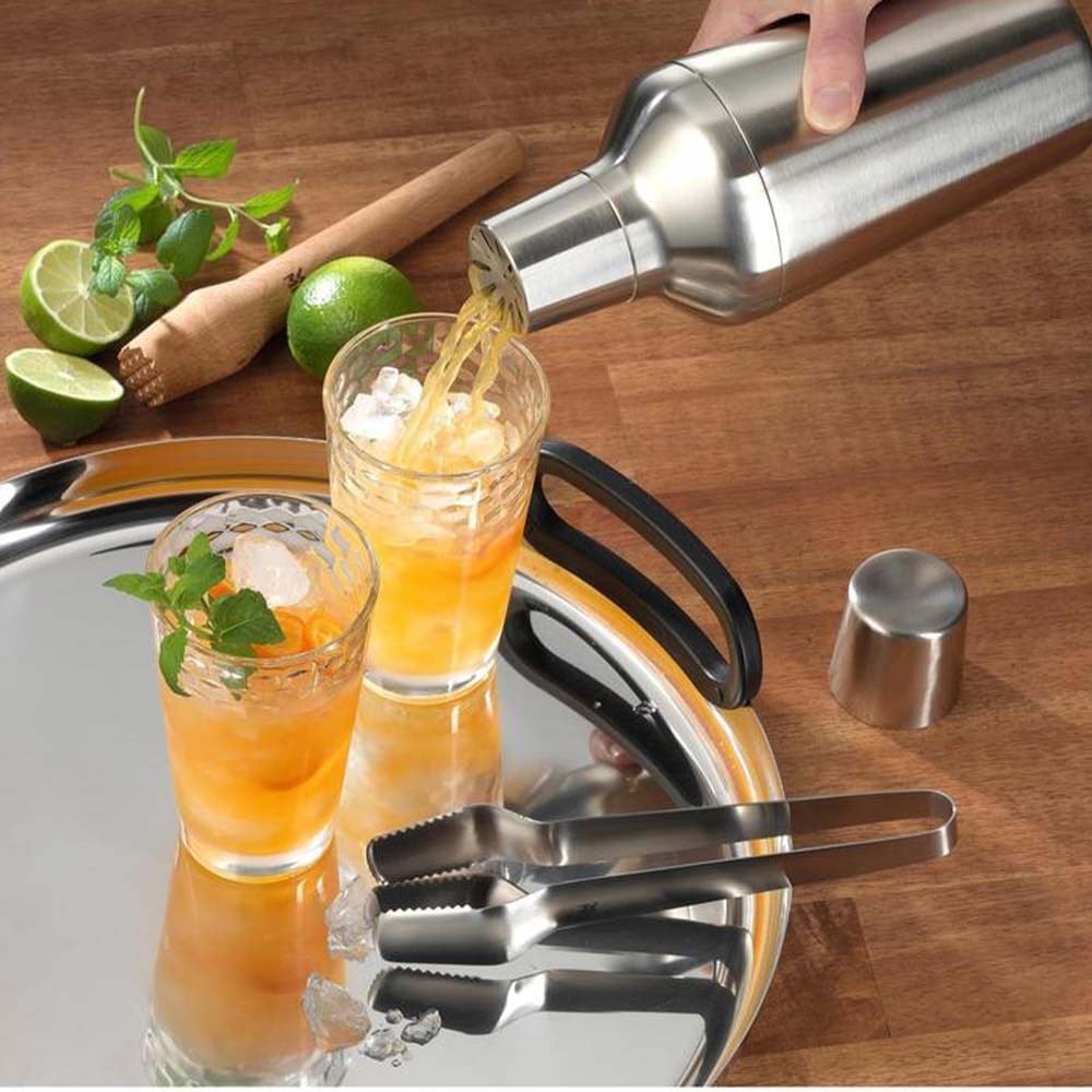 Clever & More serisiyle WMF, güzel oldukları kadar kullanışlı olan bar araçları konusunda da yardım eli uzatıyor. Gin Fizz'den Moscow Mule'a veya klasik Mojito'ya kadar bu kokteyl bar seti, kısa sürede mükemmel kokteyller sunar. Kullanılmadığında maşa ve ezici shaker içine koyularak alandan tasarruf etmenizi sağlar. Zarif set, buzu ve meyveyi tutmak için entegre süzgeçli bir çalkalayıcı, ölçüm kabı olarak da kullanılabilen bir kapak, dişli buz maşası ve tahta bir tokmak içerir. Şık, sofistike estetiği ile metal parçaların her biri Cromargan'dan üretilmiştir: paslanmaz çelik 18/10, solmaz, nötr tat ve aside dayanıklı olağanüstü dayanıklılık ve hijyen sağlar.