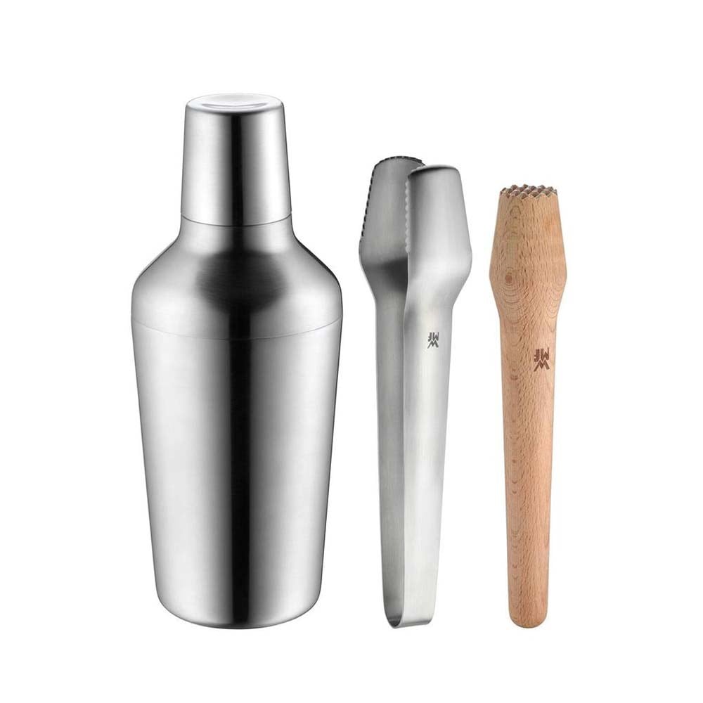 Clever & More serisiyle WMF, güzel oldukları kadar kullanışlı olan bar araçları konusunda da yardım eli uzatıyor. Gin Fizz'den Moscow Mule'a veya klasik Mojito'ya kadar bu kokteyl bar seti, kısa sürede mükemmel kokteyller sunar. Kullanılmadığında maşa ve ezici shaker içine koyularak alandan tasarruf etmenizi sağlar. Zarif set, buzu ve meyveyi tutmak için entegre süzgeçli bir çalkalayıcı, ölçüm kabı olarak da kullanılabilen bir kapak, dişli buz maşası ve tahta bir tokmak içerir. Şık, sofistike estetiği ile metal parçaların her biri Cromargan'dan üretilmiştir: paslanmaz çelik 18/10, solmaz, nötr tat ve aside dayanıklı olağanüstü dayanıklılık ve hijyen sağlar.