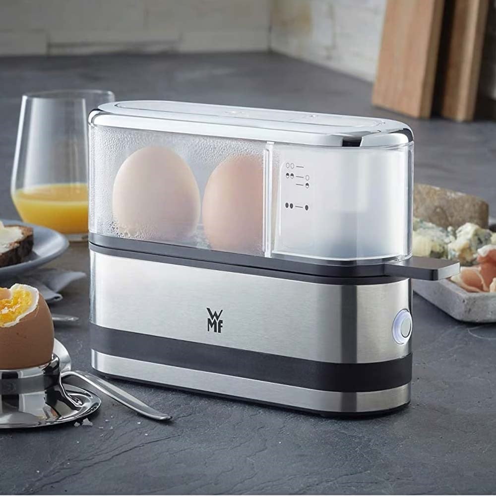 Mini yumurta pişirici yerden tasarruf sağlar ve S'den XL'ye kadar bir veya iki kahvaltılık yumurta kaynatır. Yüksek kaliteli Tritan'dan yapılmış şeffaf başlık BPA içermez, sağlamdır ve temizlenmesi kolaydır. Entegre ölçüm kabı ile su miktarı, yumurta boyutuna ve istenilen sertlik derecesine göre dozlanabilir. Yumurtalar hazır olur olmaz akustik bir sinyal duyulur.