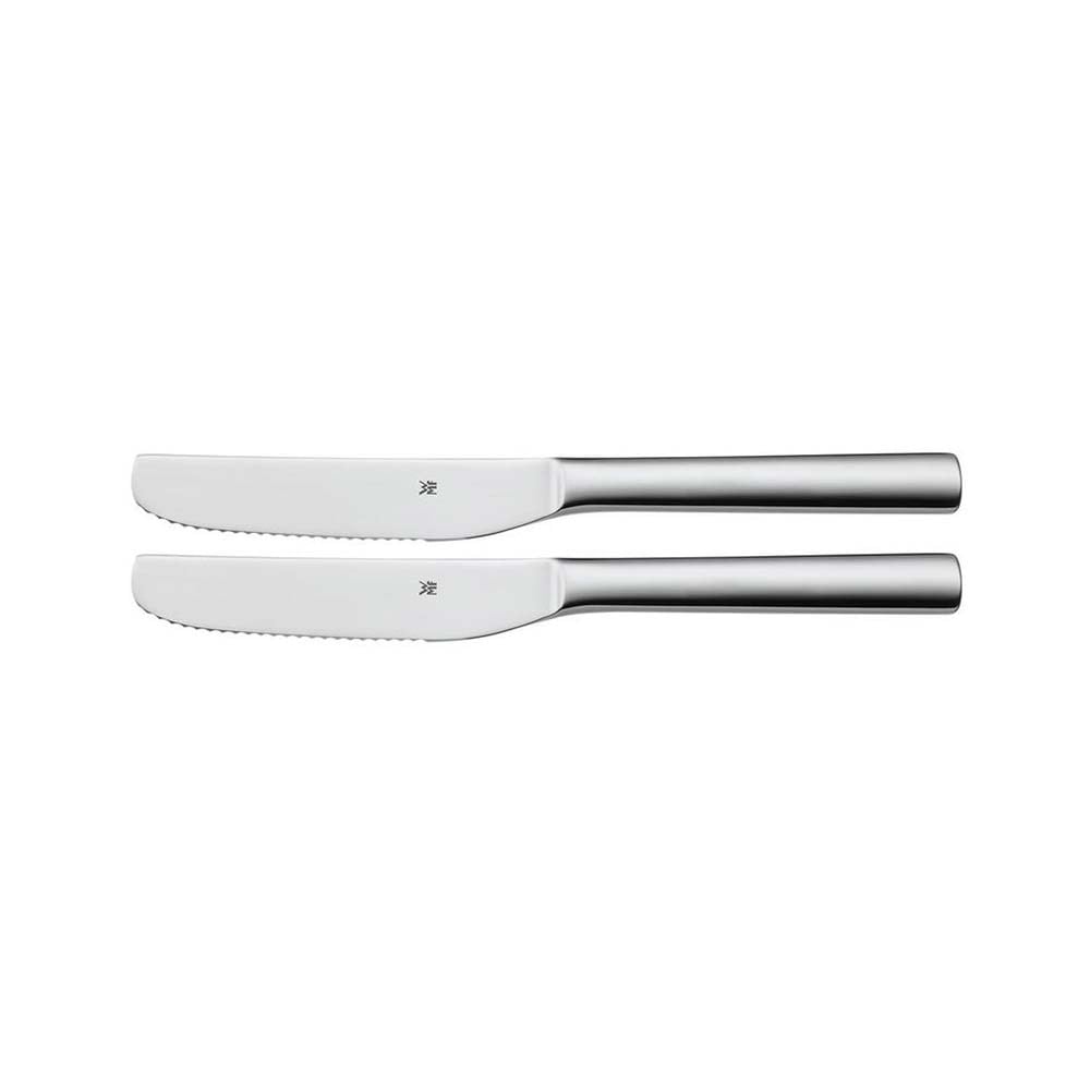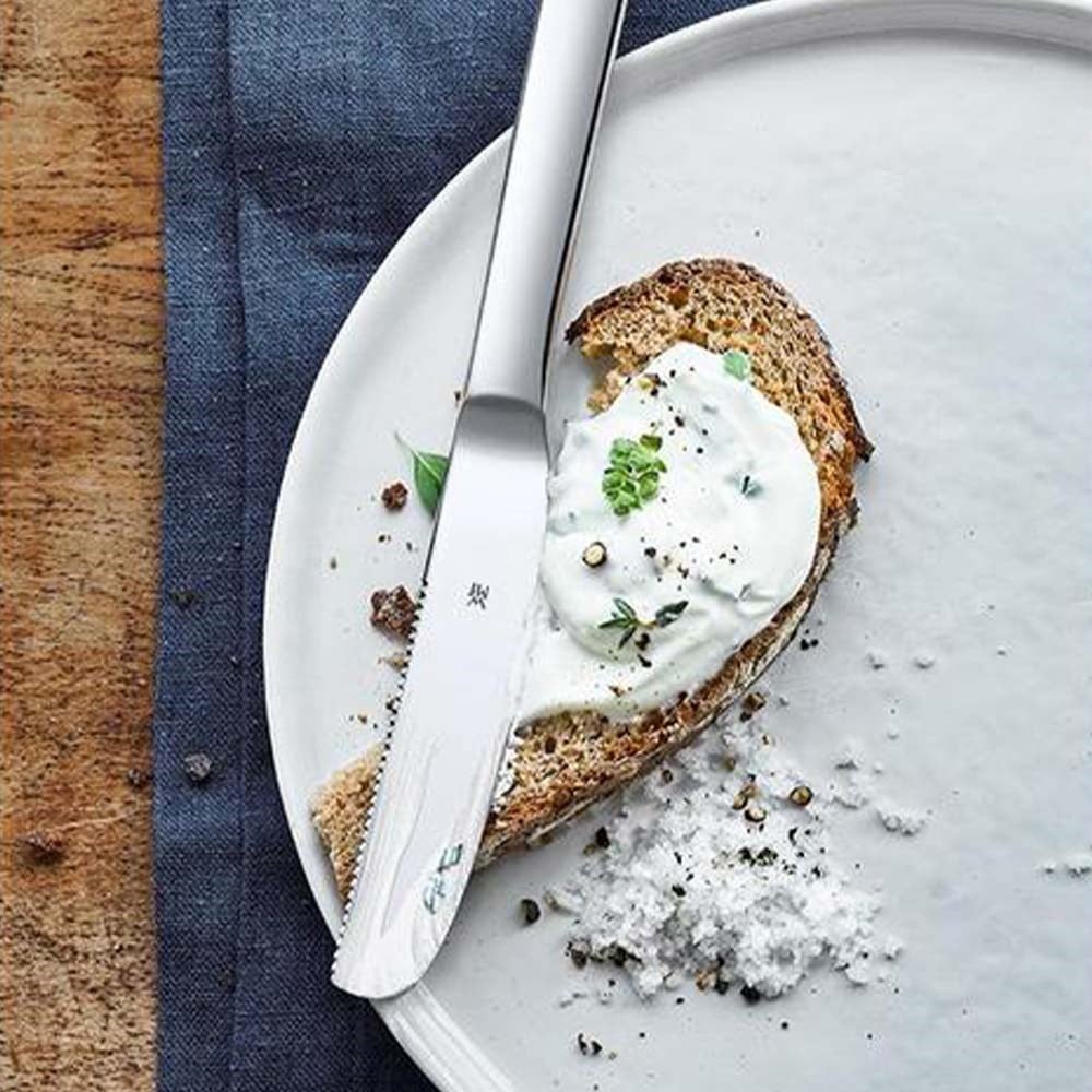 Her sofraya uygun ideal servis gereçlerini keşfedin.. Sofra gereçlerinden servis gereçlerine kadar yaklaşık 50 özel parçadan oluşan WMF Nuova koleksiyonu, zamana meydan okuyan işlevsel bir seridir. Her anı gerçek bir sofra deneyimine dönüştürür. Ekmek ve kruvasan üzerinde kolaylıkla kayan ekstra geniş uca sahip, yüksek kaliteli Cromargan® 18/10 paslanmaz çelik malzemeden yapılan bu büyüleyici kahvaltı bıçakları seti, etkileyiciliğinden asla ödün vermeyen zarif bir estetiğe ve olağanüstü dayanıklılığa sahiptir. Tek parça paslanmaz çelik malzemeden dövülerek üretilen ve bütün olarak sertleştirilen bıçaklar, uzun ömürlü keskinlik ve mükemmel kesim sağlayan özel tasarımlı tırtıklı kenara sahiptir. Geniş yüzeyi, ekmek ve hamur işlerine sürülen gıdalar için idealdir. WMF'nin ün saldığı becerileri ve teknik bilgileriyle üretilen bu özel gereçler bulaşık makinesinde yıkanabilir, bakımı kolaydır ve gıda asitlerine karşı dirençlidir. Set, illüstrasyonlar içeren yüksek kaliteli kutusuyla hediye olarak verilmeye hazırdır.