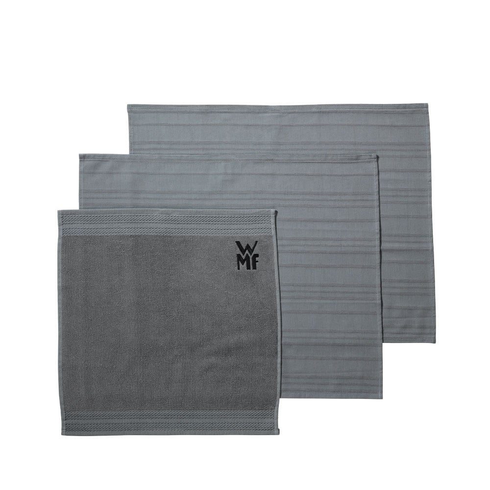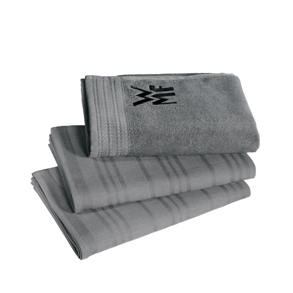 WMF'in 3 parçalı ProfiSelect mutfak havlusu seti bardakların, çatal bıçak takımlarının veya pişirme kaplarının tamamen tüy bırakmadan kurulanmasına yardımcı olur. Zararlı maddelere karşı test edilmiş ve özellikle emici olan yüzde 100 pamuktan üretilen set, bir havlu ve iki kurulama havlusundan oluşuyor. Tüm parçalar, her mutfağın tipik yerlerine asmak için pratik halkalara sahiptir ve 60 °C'ye kadar çamaşır makinesinde yıkanmaya uygundur.