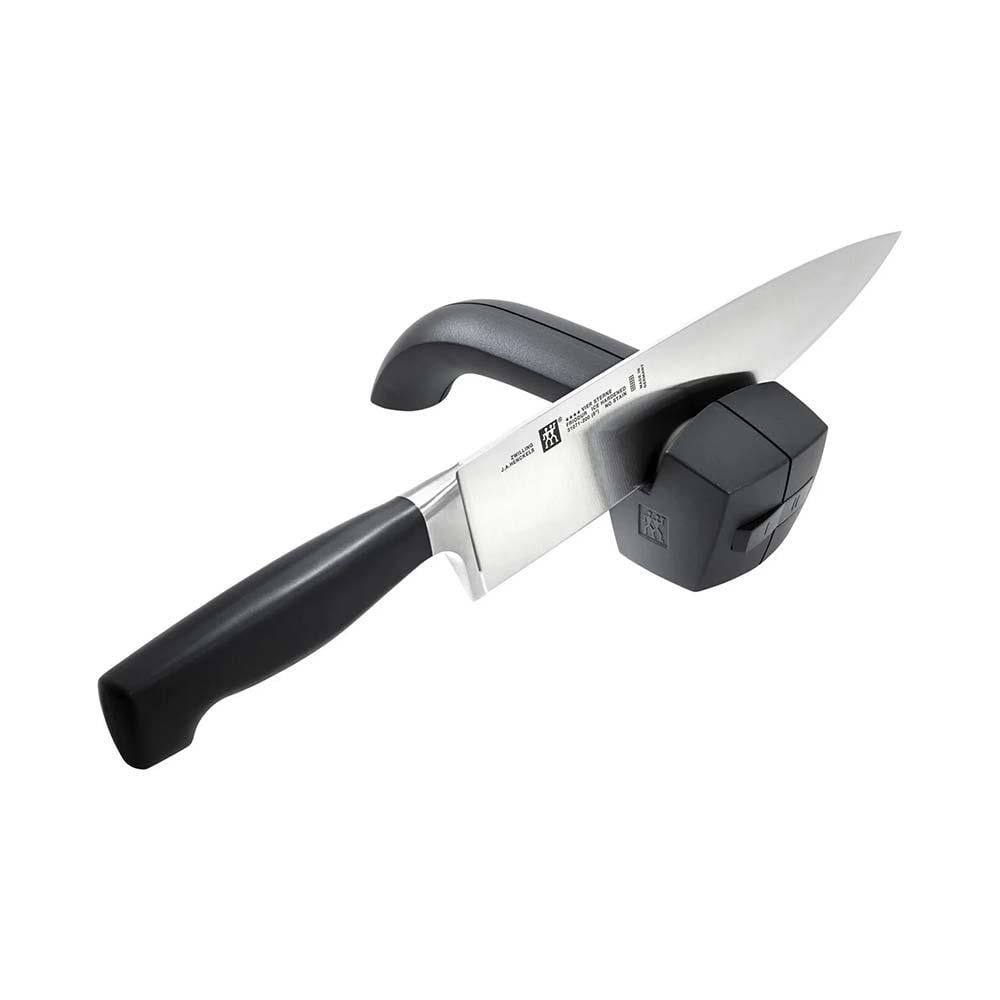 ZWILLING’in Sharp pro bıçak bileme aleti hassas kesim için çok keskin bıçaklar sağlar. Siyah plastikten yapılan bu pratik alet hem sağ hem de sol elini kullananlar içi uygundur. Sharp Pro’yu ayrıca amatörler de kolaylıkla kullanabilir. Ağzı tırtıklı olmayan her tür mutfak bıçağı için uygundur. Bu pratik yardımcı, küt bıçakları kendinizin keskinleştirmesi için mutfağınızda faydalı olacaktır. Sertleştirilmiş çeliğe sahip paslanmaz çelik bıçaklar bile zaman içinde sertliklerini kaybederler. Bıçak bileyici bu nedenle güvenilir ve hassas kesim sonuçları elde etmek için idealdir. ZWILLING’in bileyici aleti ile, balıkları, etleri ve diğer mutfak malzemelerini zahmetsizce dilimlemek için bıçaklara keskinliklerini yeniden kazandıracaktır.