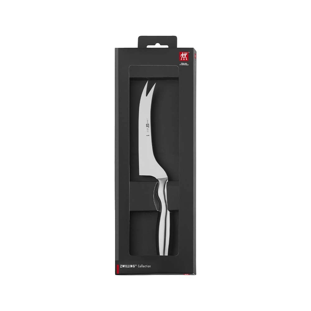 ZWILLING® Collection serisinden çatal uçlu peynir bıçağı, siz ve misafirlerinizin peyniri zahmetsizce kesmesini ve servis etmesini kolaylaştırır. Peyniri kesmek ve kaldırmak için özel olarak geliştirilmiş bir bıçağa sahiptir. Bu bıçakla, iyi peynirin tadını çıkarabilirsiniz. Peynir bıçağının sapı, yüksek kaliteli paslanmaz çelikten yapılmıştır. Alt kısımdaki hafif dalgalı şekli bıçağın rahat kullanımını sağlar. Bıçak ağzı da paslanmaz çelikten imal edilip, peynir dilimlemek için en iyi açıyı oluşturmak için düz olarak yerleştirilmiştir. Pratik çatal ucu, peyniri tabaktan kolayca alabilen iki çatal içerir. Bu nedenle peynire elinizle dokunmanıza gerek kalmaz.